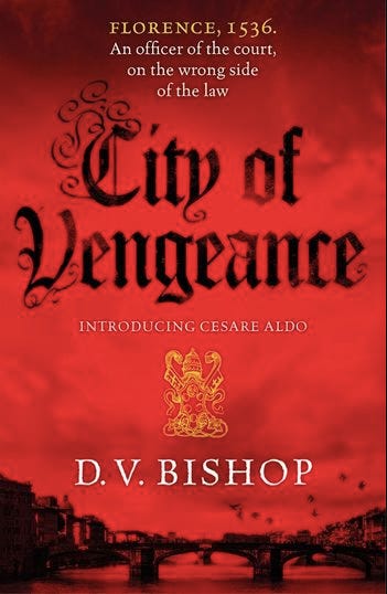 The first in D. V. Bishop’s Cesare Aldo historical mysteries. From the cover copy: “Florence. Winter, 1536. A prominent Jewish moneylender is murdered in his home, a death with wide implications in a city powered by immense wealth. Cesare Aldo, a former soldier and now an officer of the Renaissance city’s most feared criminal court… uncovers a plot to overthrow the volatile ruler of Florence, Alessandro de’ Medici.”